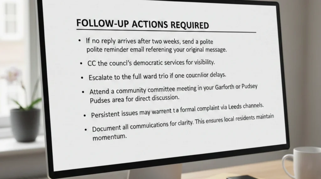 Escalate to the full ward trio if one councillor delays. Attend a community committee meeting in your Garforth or Pudsey area for direct discussion. Persistent issues may warrant a formal complaint via Leeds council channels.